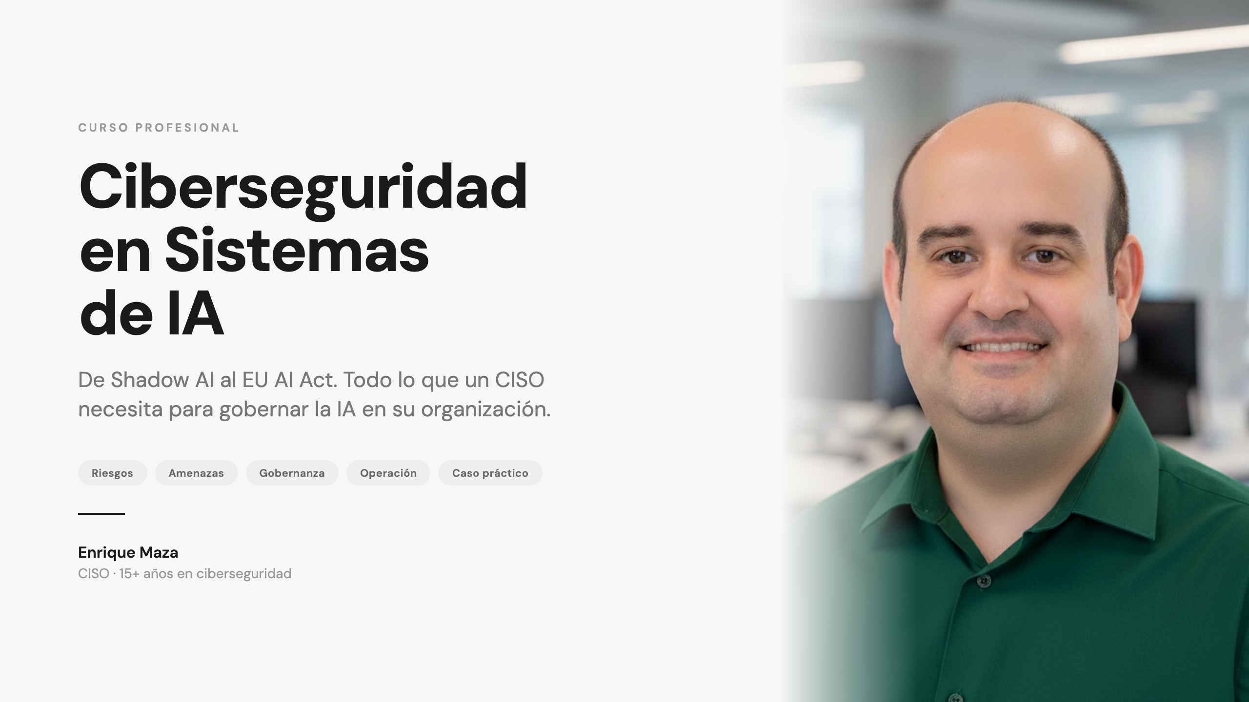 Curso profesional para CISOs y responsables de seguridad. +12 horas de vídeo, 100% asíncrono. Riesgos, amenazas, cumplimiento normativo y gobierno de la IA. Incluye material didáctico, plantillas para aplicar en tu empresa y un caso práctico integrador.